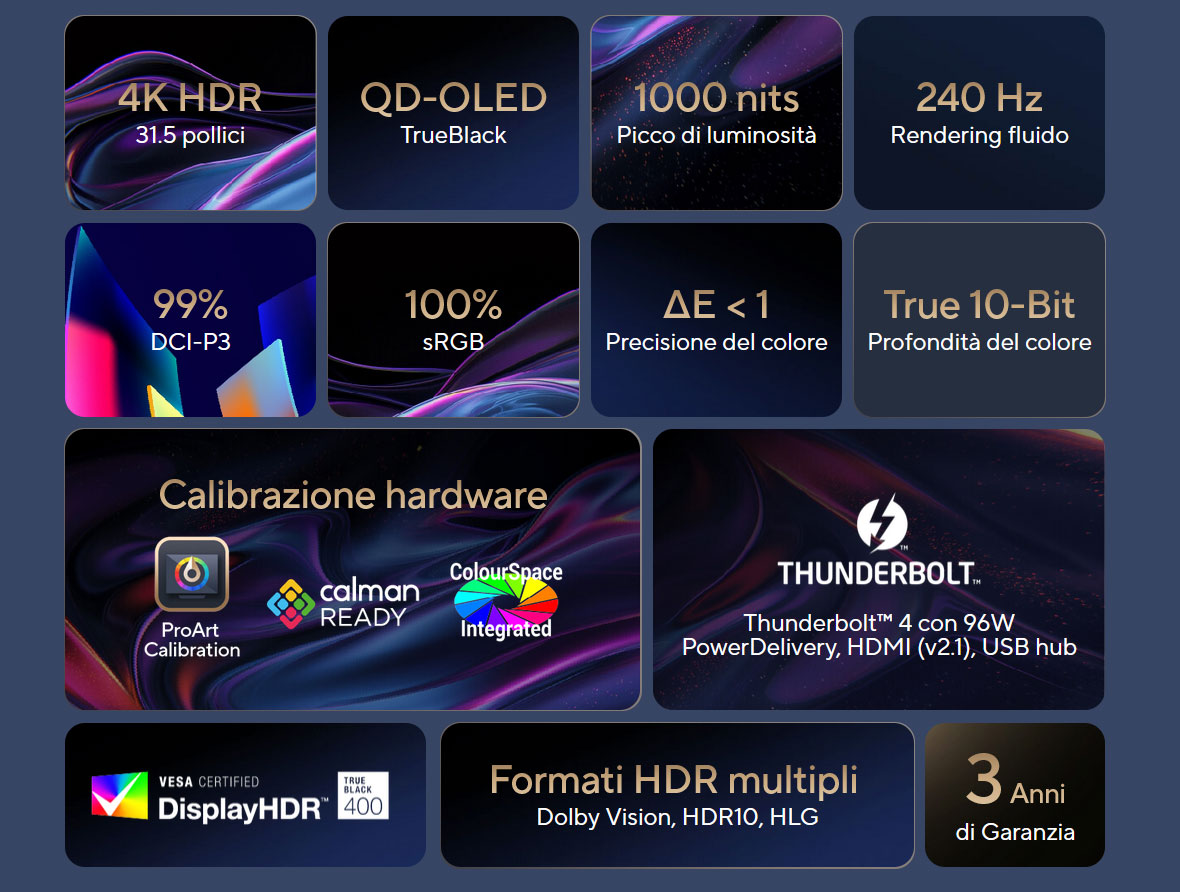 - Prestazioni cromatiche E<1 leader a livello mondiale e tecnologia di calibrazione hardware ASUS ProArt per l’ottimizzazione della precisione del colore e il ripristino dei profili colore;
